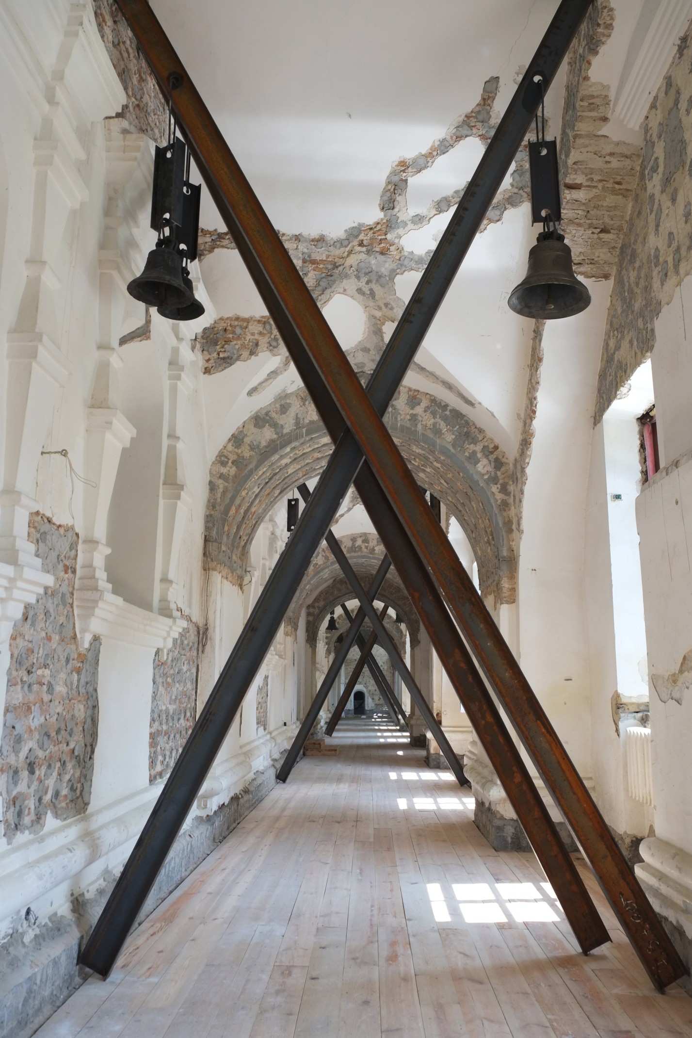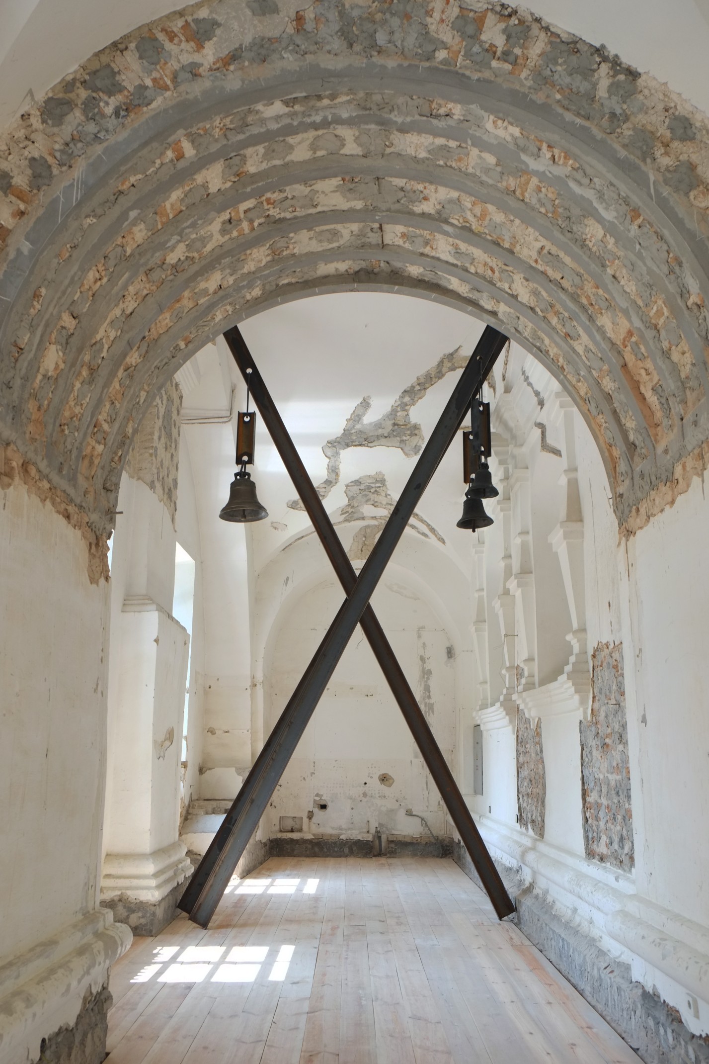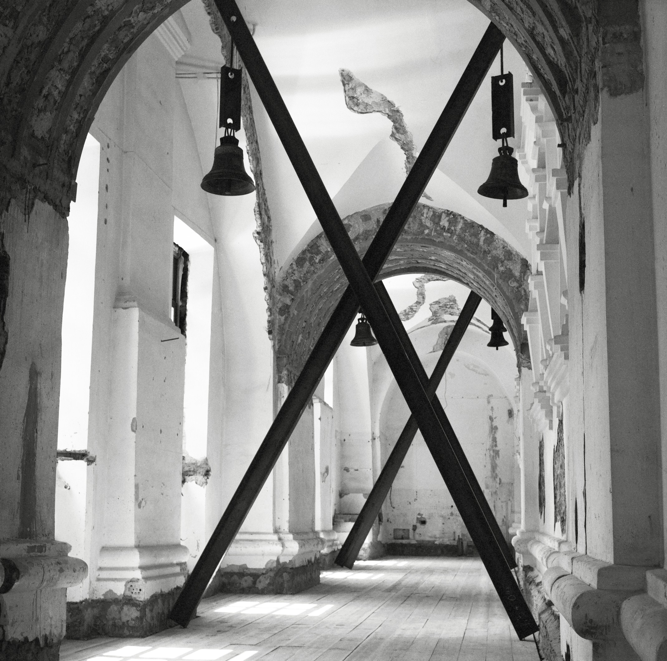 In 1997, a rare opportunity arose to work with the artist Jannis Kounellis in Kyiv within the apse of what was, at that time, the Soros Center for Contemporary Art, housed in a renovated baroque-era building that had served as the original location of Kyiv-Mohyla Academy. Kounellis’s proposal was simple yet expansive—an intervention comprising steel I-beams mounted along the length of the nave from which would hang a series of church bells. Kounellis’s only conditions for the bells were that they be historic in origin and made in Ukraine. The artist’s plan corresponded with his role as a central figure of the Arte Povera movement, which possessed, according to Germano Celant, “a new attitude for taking repossession of a ‘real’ dominion over our existence [leading] the artist towards continual forays outside of the places assigned to him.”